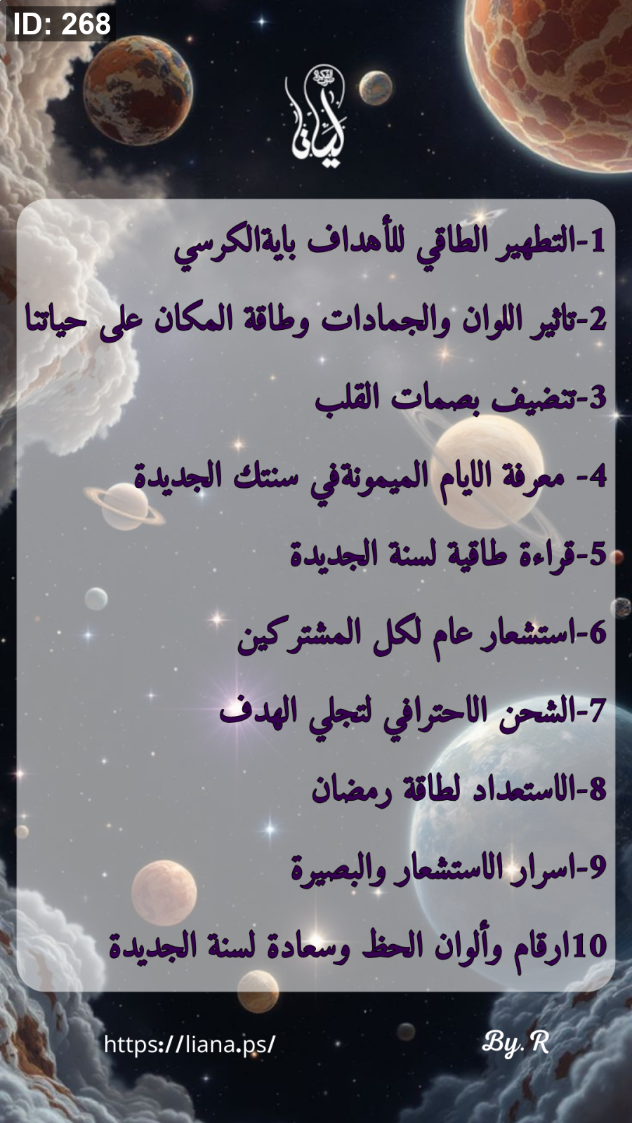 1-التطهير الطاقي للأهداف كرسي9-اسرار الاستشعار والبصي10ارقام وألوان الحظ وسعادةلسنة ال